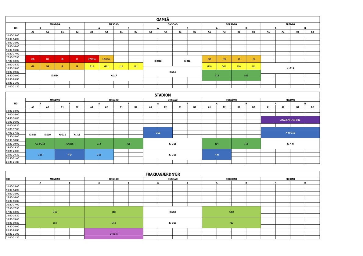 | Jenter 15 år (2011) | Stadion B1+B2 Stadion B1+B2 Stadion B1+B2 | Mandag Tirsdag Torsdag | 18:00-19:30 18:00-19:30 18:00-19:30 | Dag Frode Monclair Tønnesen | 94508321 | dagfrode17@hotmail.com |
