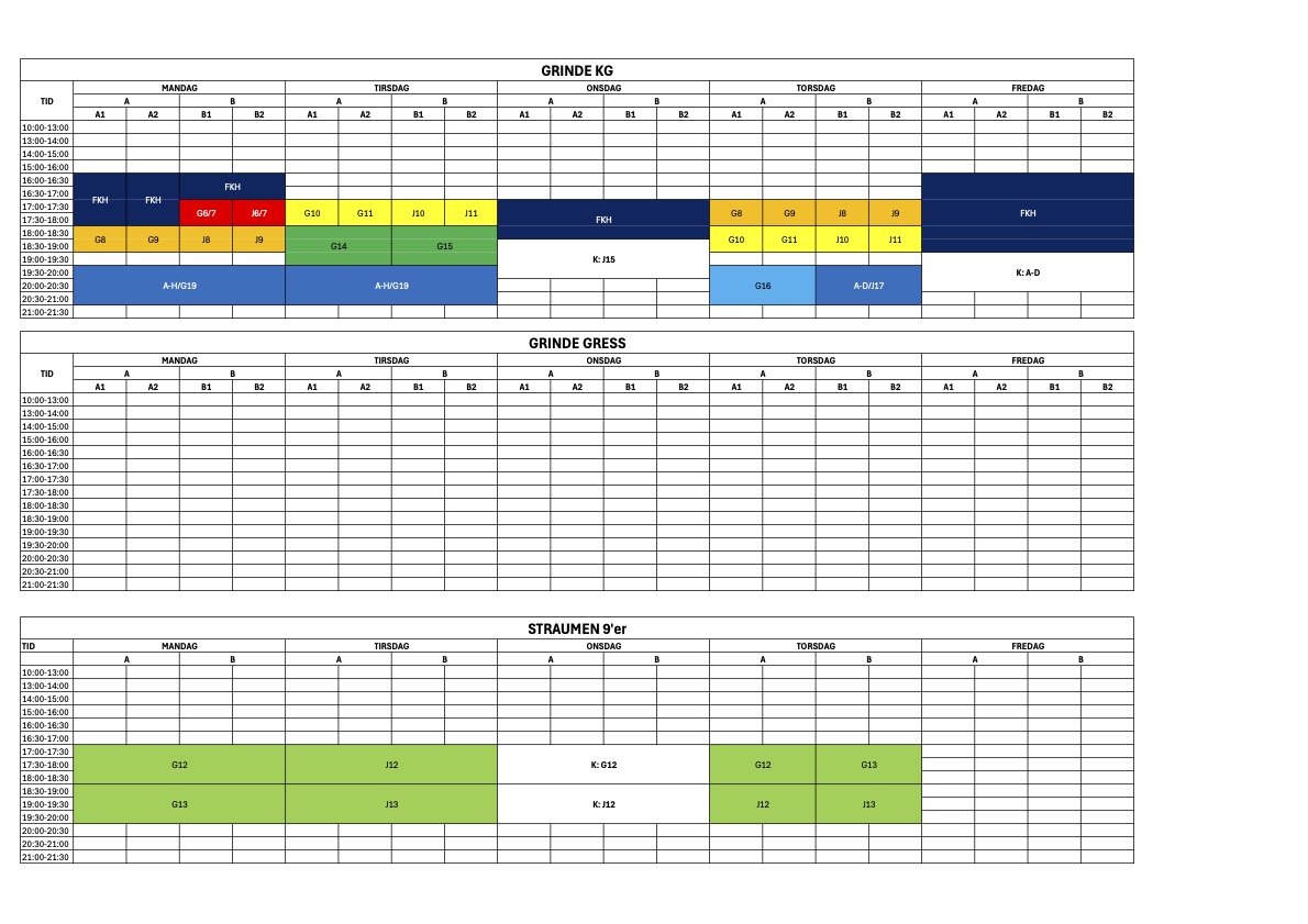 | Gutter 19 (junior) (2009-2007) | Grinde KG Grinde KG Stadion A1+A2 Stadion | Mandag Tirsdag Onsdag Fredag | 19:30-20:00 19:30-20:00 16:30-18:00 16:30-18:00 | Rune Røksund | 97606235 | runeroek@hotmail.com |